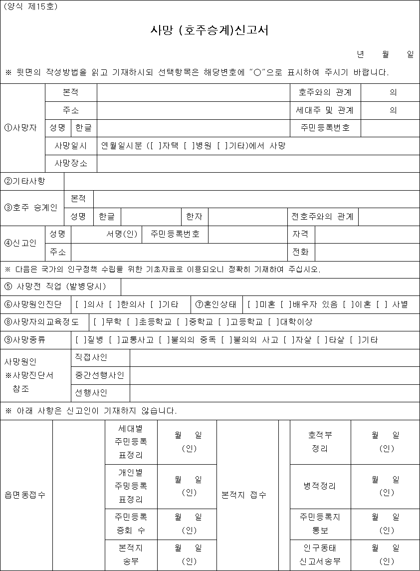 * »ç¸Á½Å°í¼¿¡´Â Áø´Ü¼ ¶Ç´Â °Ë¾È¼¸¦ ÷ºÎÇÏ¿©¾ß Çϸç, ºÎµæÀÌÇÑ »çÀ¯·Î ÷ºÎÇÏÁö ¸øÇÒ ¶§¿¡´Â ±× ÀÌÀ¯¸¦ ±âŸ»çÇ×¶õ¿¡ ±âÀçÇÏ°í »ç¸Á»ç½ÇÀ» ¾Ë°í ÀÖ´Â ÀÚÀÇ »ç¸ÁÁõ¸í¼ ¸¦ ÷ºÎÇÏ¿©¾ß ÇÕ´Ï´Ù(»ç¸ÁÁõ¸í¼ º°µµ ºñÄ¡).